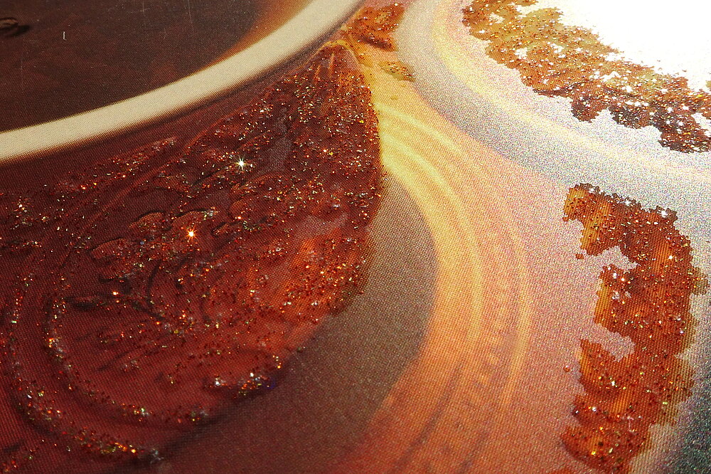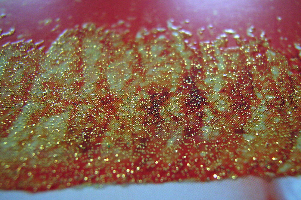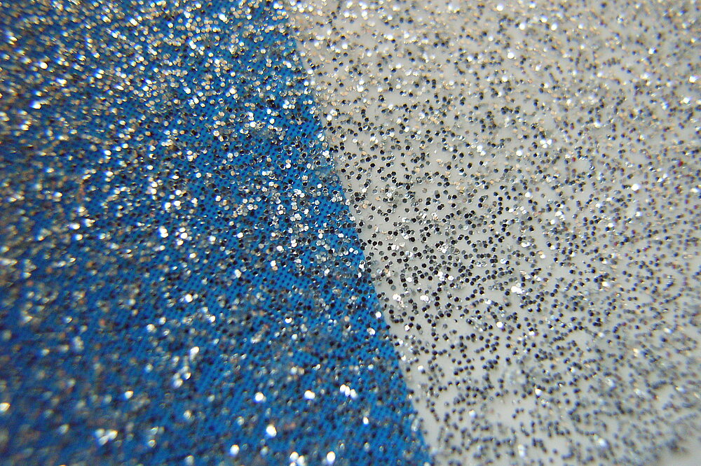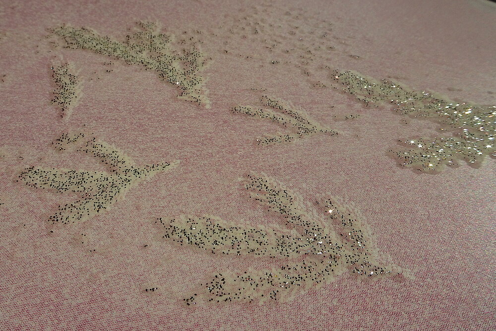 The glitter particles have a size between 50 microns and 400 microns and reflect depending on their color, quantity and size of the light. To reach a certain thickness and an even application of the particles, the glitter paint is applied by screen printing. There is no special equipment required of the printing press, because this procedure is not performed inline.