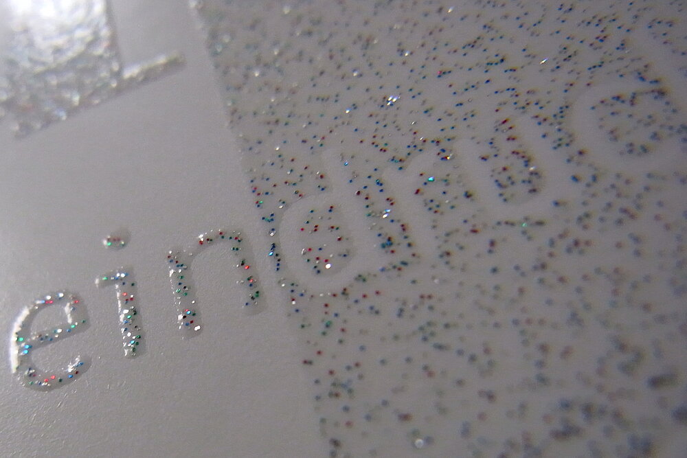 With a coarse glitter paint can be no fine lines or sharp edges print. The more detailed the design, the finer the glitter must be selected. For uncoated papers before a test print should be made, as they for this type of finishing are poorly suited. Particular caution is advised when further processing. A high layer transfer the stack for cutting or stamping must be kept low, since otherwise imprints arise. Generally you should only be printed on one side. Also full bleed prints should be avoided, as it may come in trimming else chipping. In addition, no paint in the areas of utilization, cutting and creasing rules should be. A subsequent bonding or printing is not possible.
