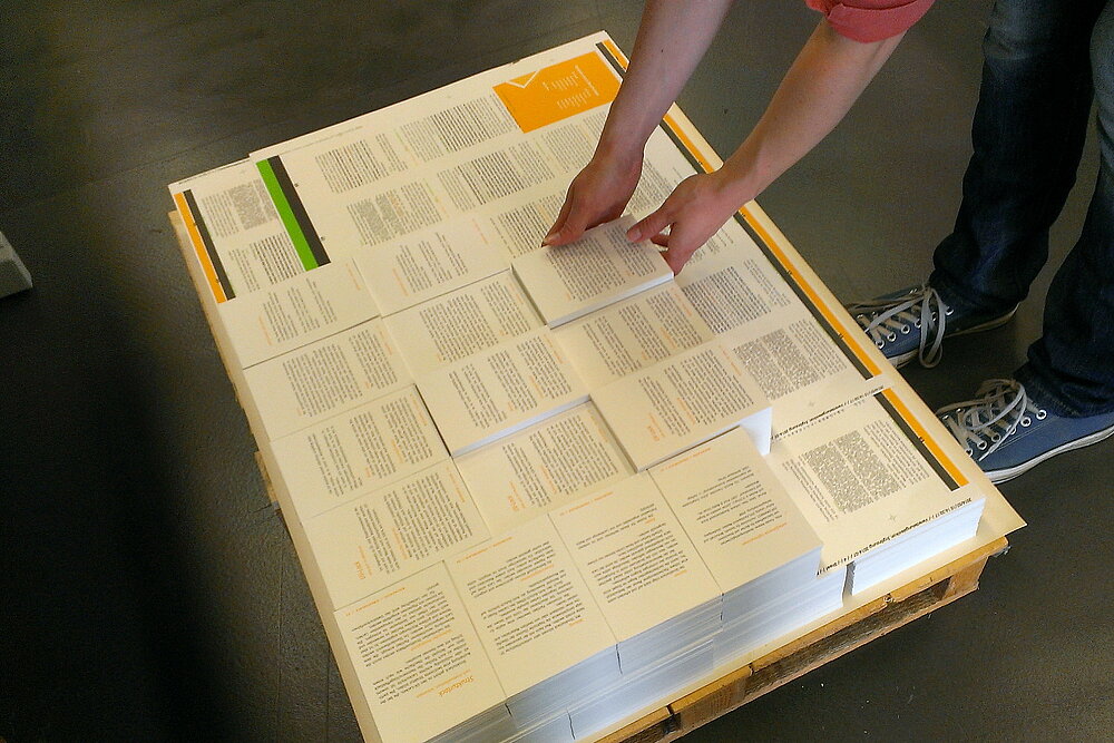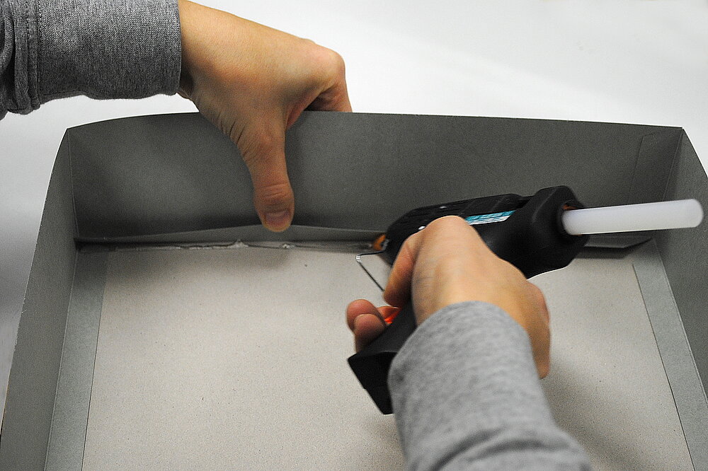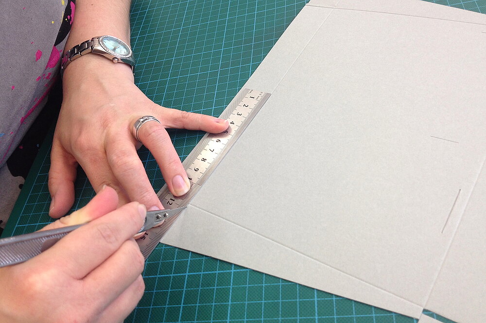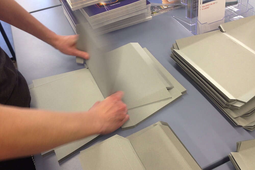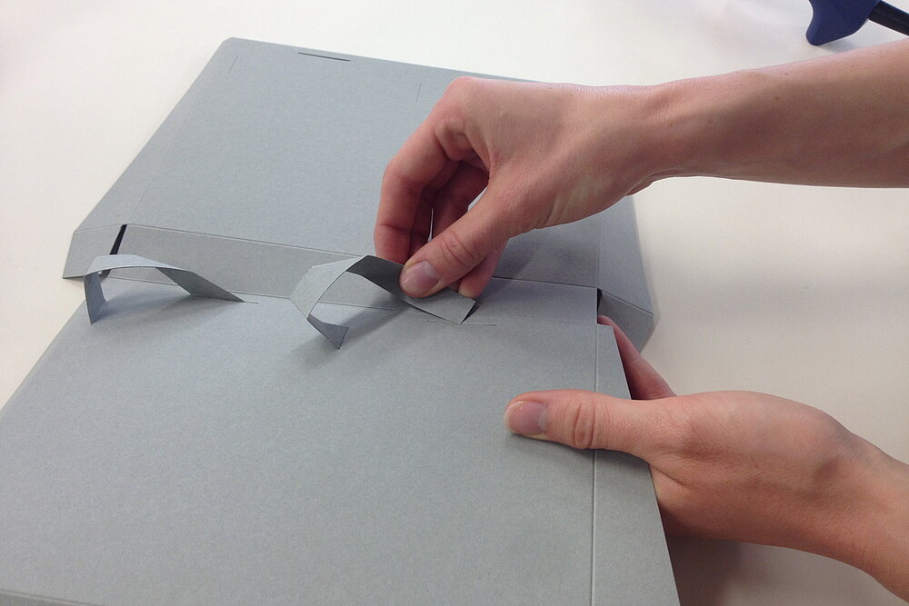 Die Musterbox besteht aus zwei vorgefertigten Schachtelelementen (Boden, Deckel), die mit einem Schachtelhals und der sogenannten Bank, einem Pult als Auflagefläche für die Fächer, ausgestattet werden. Diese Elemente werden aus Karton gestanzt. Zuerst wird das Material für den Hals in den Boden geklebt. Danach wird die Bank vorbereitet. Dafür muß der gestanzte Zuschnitt gefalzt und verklebt werden. Um später den Musterfächern den richtigen Halt in der Musterbox zu verschaffen, werden die Pulte mit Magneten sowie Schlaufenelementen versehen und danach in den Boden der Musterbox geklebt. Die vier Fächer werden aufgelegt. Der Deckel wird abschließend mit einem Informationsblatt zu Projektpartnern und Inhaltsverzeichnis versehen.