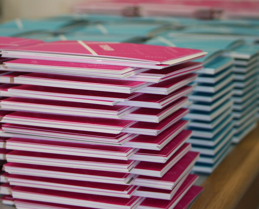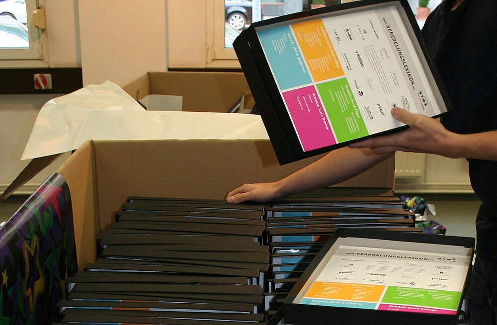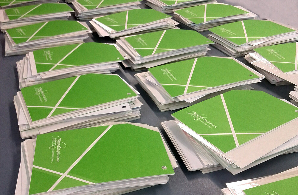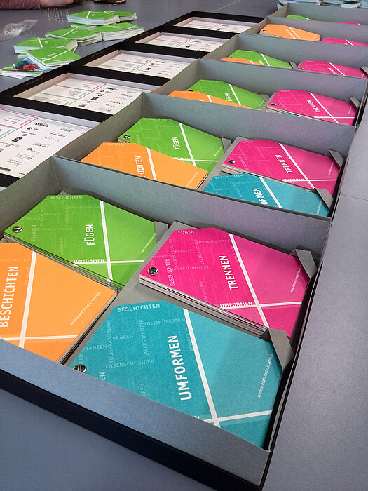 Die vier Fächer beinhalten insgesamt 32 Veredelungsverfahren, die jeweils aus Informationsblättern sowie einem Test- und einem Showelement bestehen. Dazu kommen Deckblätter sowie Impressum und Rückseite, was den Fächer komplettiert. Die Datenblätter werden im Stapel beschnitten und gebohrt, eine Ecke wird abgetrennt. Danach werden alle Daten und Musterkarten von Hand zum Fächer zusammengetragen und mit einer Buchschraube versehen. Dabei dürfen weder Karten fehlen oder vertauscht werden.
