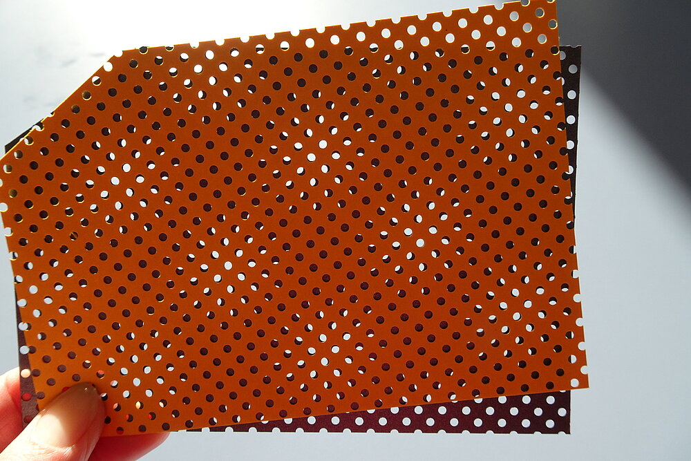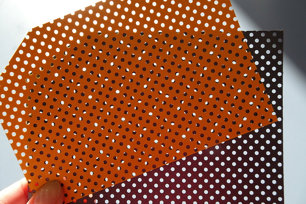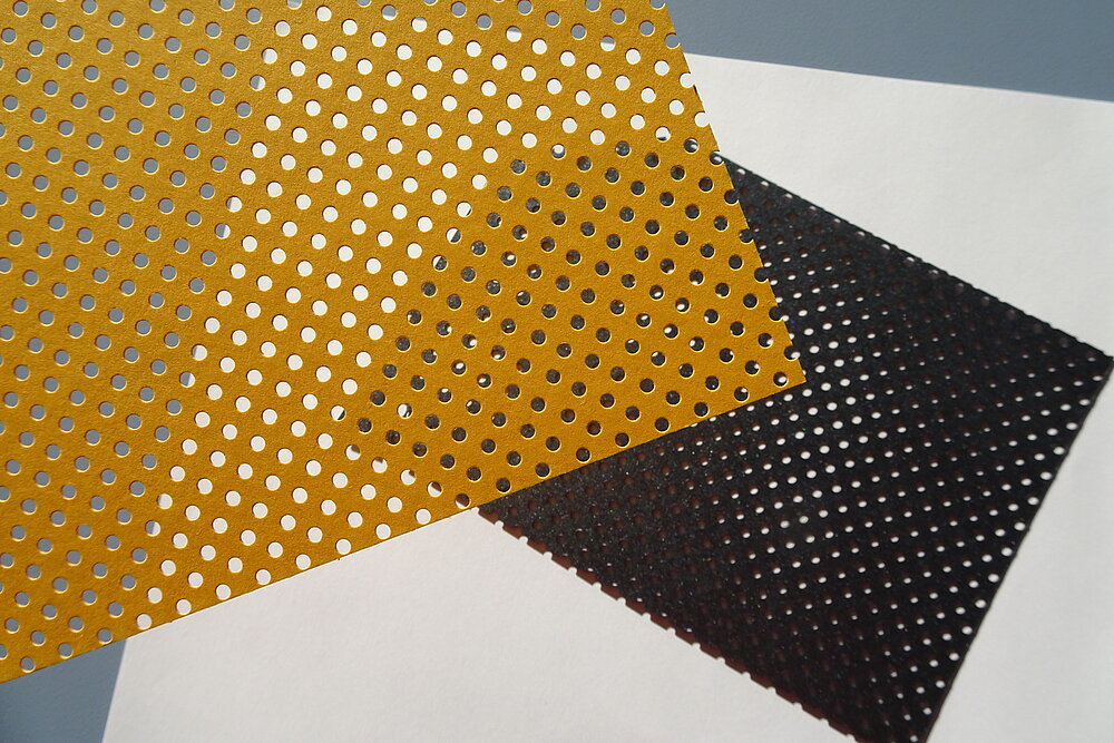 Flächenperforierte Bogen überzeugen durch Leichtigkeit und die Wirkung von Licht und Schatten und interpretieren das Thema Transparenz neu. Sehr schöne Wirkungen können erzielt werden, wenn die perforierte Fläche mit kontrastreichen oder spiegelnden Materialien hinterlegt wird oder mit einem zweiten gelochten Bogen, wodurch Moiréeffekte erzielt werden.